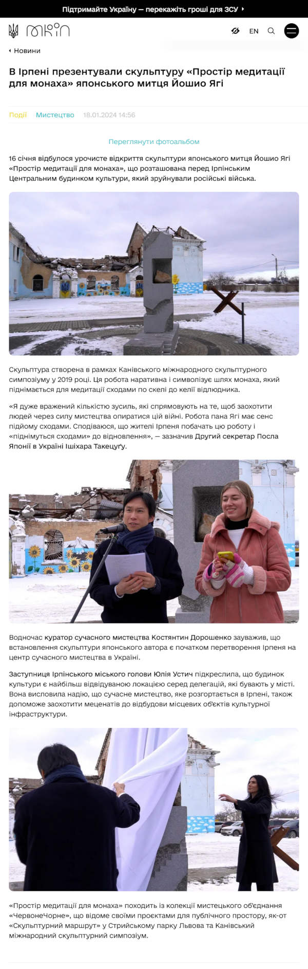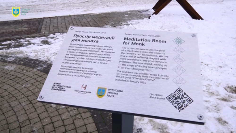 イルピン市長オレクサンドル・マルクシン氏のコメント 英雄都市イルピンはリヴィウに次ぐ2番目の都市となり、その空間は「チェルボーン チョルネ」協会のおかげで現代アートで満たされています。彫刻「僧侶のための瞑想空間」は、カニウ国際彫刻シンポジウムで日本人八木ヨシオによって制作されました。自分の作品は岩の上の階段を登って隠者の部屋に向かう修道士の道を象徴していると述べています。 修道士の道は茨の道であり、私たちが今、レンガ一つ一つを再建し、コミュニティを集めているのと同じです。彫刻を設置する場所も象徴的です。破壊された中央文化会館の跡地は、さまざまな政治家、代表団、慈善家がイルピンで最も訪れる場所の1つです。そして、これは偶然ではありません。敵はウクライナ国民だけでなく、私たちの思想、国家アイデンティティ、私たちの文化、言語、つまり自由な民族の象徴を殺そうとしているのです。 残念なことに、私たちの文化施設は未だに後援者の注目を集めていないままです。しかし、私は、特に八木ヨシオの彫刻が、イルピン共同体の文化生活の再建に向けて、世界のより多くの注目を集めることができることを願っています。 芸術団体「チェルボーン・チョルネ」との、このコラボレーションを企画してくれたアートアドバイザー、ソフィア・マルティニューク氏と、会議に出席し、現代アートのオブジェを設置し、修復に参加してくれた収集家で協会の責任者であるユーリー・スタシキフ氏に感謝したいと思います。 イルピン市・副市長ユリヤ・ウスティッチ氏のコメント 本日、イルピンの中央文化会館跡で、傑出した日本人芸術家、八木ヨシオによる彫刻が除幕されました。 この美術品は「チェルボーン・チョルネ」芸術団体によってイルピンに持ち込まれました。この彫刻は「僧侶のための瞑想空間」と呼ばれ、作家の八木ヨシオ氏が2019年のカニウ国際彫刻シンポジウムの一環として制作しました。作者によれば、この作品は瞑想するために人里離れた場所へ岩階段を登る修道士の道を象徴しているという。 オレクサンドル・マルクシナ市長を代表して、文化人、コレクター、美術協会「チェルボーン・チョルネ」創設者であるユーリー・スタシキフ氏に対し、プロジェクトの素晴らしい実施に対して心からの感謝の意を表します。また、イルピン市の芸術問題に関する顧問であるソフィア・マルティニューク氏と、このイベントを高いレベルで企画してくれたチームにも感謝の意を表したいと思います。 市議会議員オレクサンドル・パシチンスキー氏のコメント 今日、英雄都市イルピンの、ロシア人によって破壊されたイルピンスキー中央文化会館の前に、日本人芸術家八木ヨシオによる「チェルボーン・チョルネ」美術協会のコレクションからの新しい彫刻「僧侶のための瞑想空間」が登場。 彫刻家によれば、この作品は、瞑想のために岩の階段を登って隠者の居室に向かう修道士の道を象徴しているという。 市の再建チームの活動は、ロシアの攻撃による壊滅的な影響の回復と排除だけを目的としているのではなく、市の発展のために、文化コミュニティーとの協力による新たな計画作りにも向けられている。そしてこの計画においては文化的要素が重要な役割を果たします。 その計画のひとつは、ウクライナで成功を収めた興味深いプロジェクトをイルピンに誘致することです。 そのため、市と芸術団体「チェルボーン・チョルネ」との協力というアイデアが生まれました。 私たちは、信じられないほど困難な時期に効果的なサポートをしてくださった国際的なパートナー、アーティスト、パトロンに感謝しています。 共に、密接に協力することによって、私たちは困難を克服することができるでしょう。 作品と共に設置された」銘板 ![]() Author: Yoshio Yagi - Japan,2019 Meditataion Room for Monk The sculpture symbolizes the path of a monk who climbs the stairs to the hermit's cell to meditate.We live in a world of suffering plagued with wars,pandemics,and environmental problems.The new world pushing us to the verge of finding new concepts in an ever-changing world. The sculpture was provided to the Irpin city territorial community from the collection of the art group "Chervone Chorne" installed in January 2024 僧侶のための瞑想室 この彫刻は、瞑想するための隠者の小部屋へと続く階段を登る修道士の道を象徴している。私たちは戦争、パンデミック、環境問題に見舞われた苦しみの世界に住んでいる。我々は、変化し続ける世の中で、新しい世界に至るに為の、新たな概念を見つけるべく瀬戸際に追い込まれている。 この彫刻は、アートグループ「Chervone Chorne」のコレクションからイルピン市の地域社会に提供され、2024年1月に設置された。 Chervone Chorne FB Chervone Chorne HP 地元メディア ITV 記事ページ [戻る] |