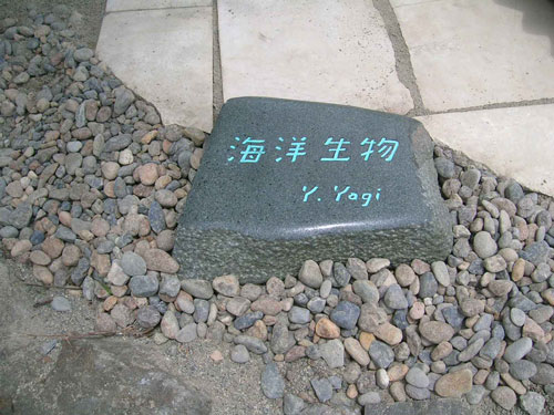 プルーンの樹とミントに囲まれた大理石の作品です。
